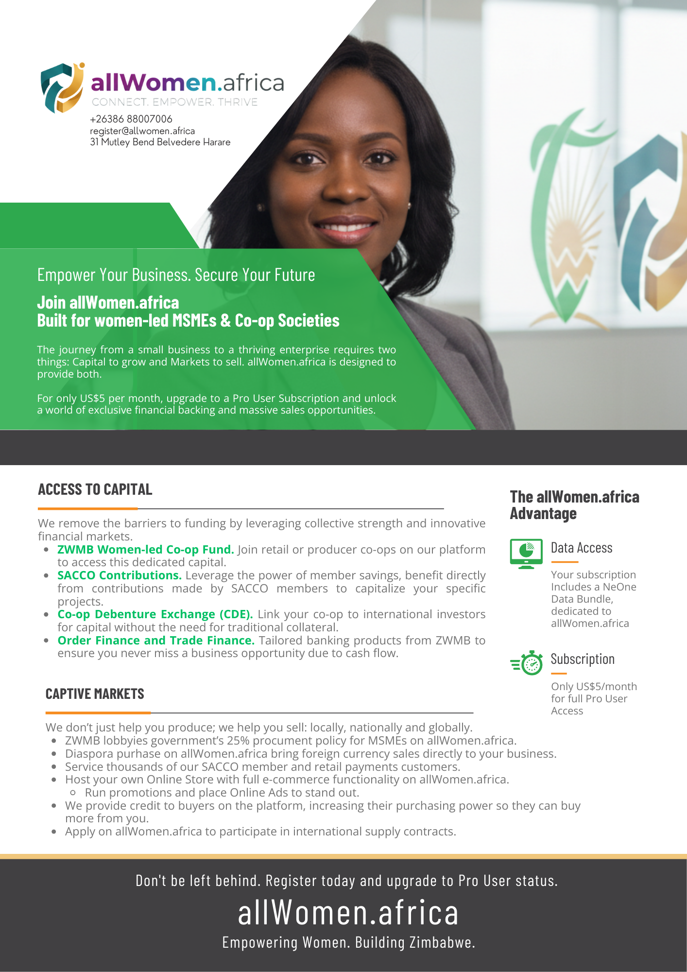 The journey from a small business to a thriving enterprise requires two things: Capital to grow and Markets to sell. allWomen.africa is designed to provide both. For only US$5 per month, upgrade...